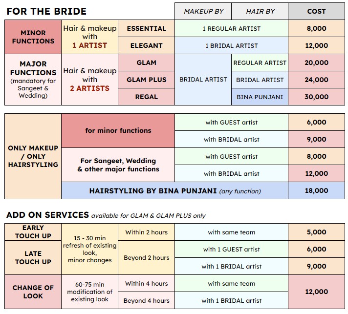 We also offer multiple options for the bride - for Sangeet / Wedding, you can choose between GLAM, GLAM PLUS or REGAL, while for other functions, you can choose ESSENTIAL onwards.